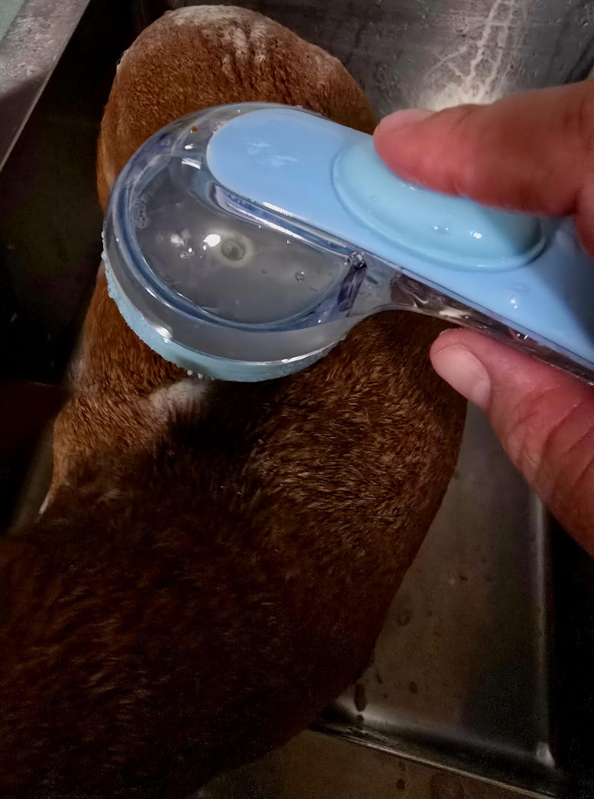 Yes. That's exactly what it's designed for. Thick double coats are the #1 reason bacteria goes undetected — your hands can't penetrate the undercoat, but the washer bristles can. Owners of Huskies, German Shepherds, and Golden Retrievers report the biggest difference.