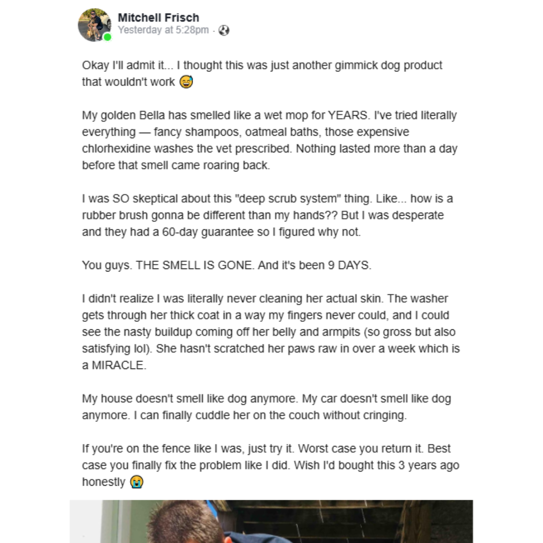 Because it eliminates bacteria at the source, you'll actually need to bathe your dog less than before.