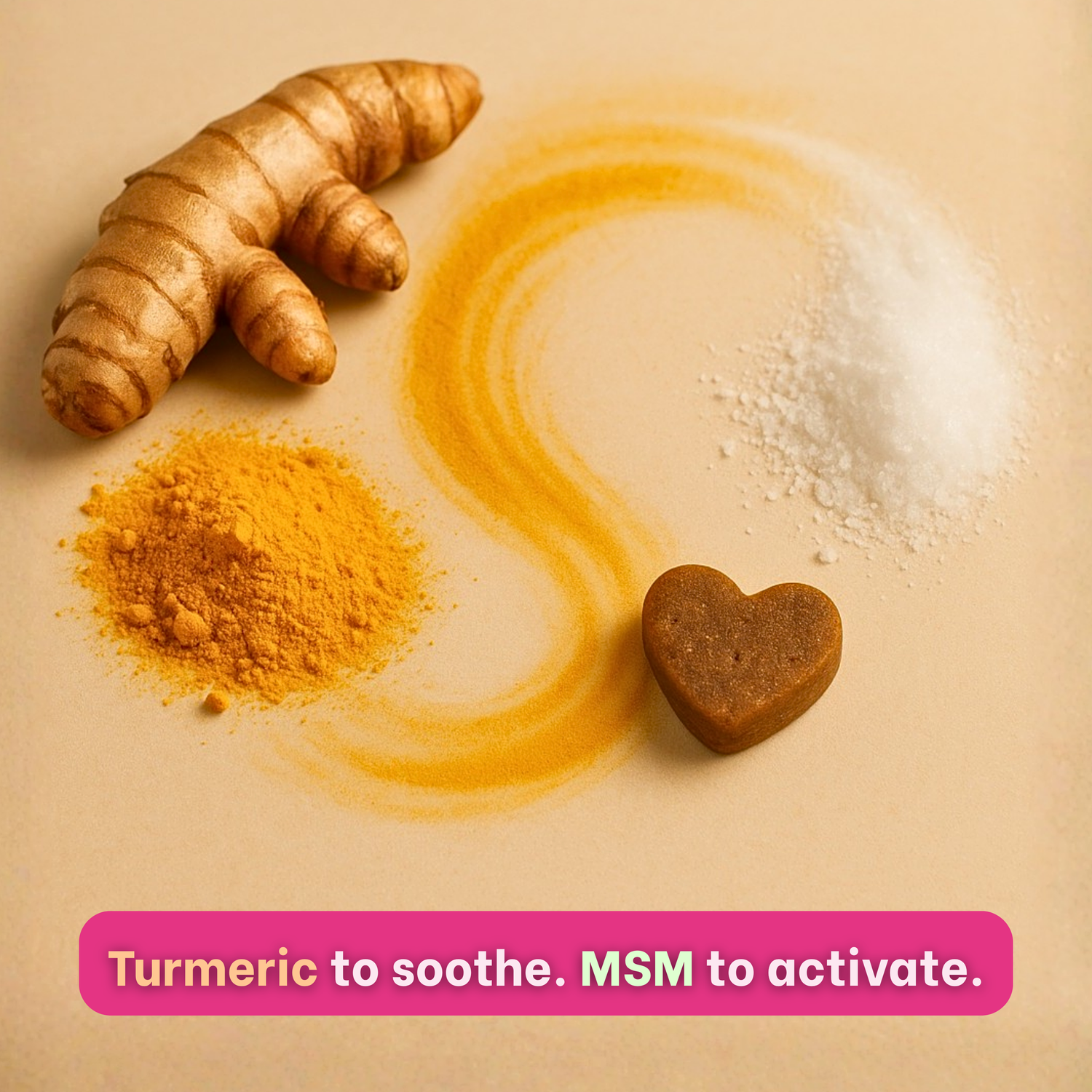 We use Activated Turmeric + MSM designed to support comfort and confidence in movement, especially for small dogs who jump, climb, and wiggle all day.